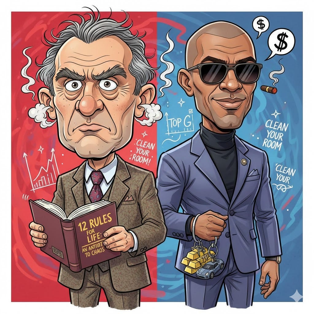 Jordan Peterson, by contrast, taps into the hunger for meaning and personal responsibility. While I disagree with his political ideology, I find his verbal approach very alluring, and I completely get his appeal. He opens by validating the frustration that men genuinely feel—an acknowledgment that transcends ideological disagreements. His core message is one of immediate, concrete action, providing an intellectual framework for self-improvement and purpose.